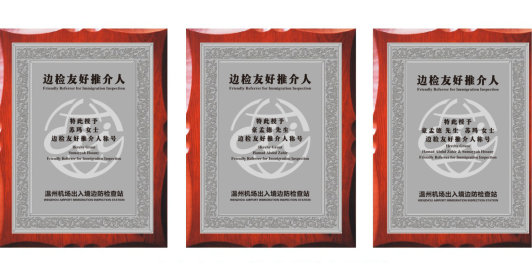 溫州機場出入境邊防檢查站站長劉浩與豪孟德、蘇瑪夫婦簽約,并為他們頒發榮譽聘書。