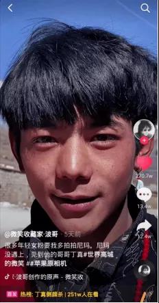 丁真原本只是生活在四川甘孜普普通通的一個(gè)藏族小伙,因?yàn)橐淮闻既坏亩兑襞臄z,把他推向了大眾的視野。這段五秒左右的丁真懟臉視頻,竟然在互聯(lián)網(wǎng)引起軒然大波。 視頻轉(zhuǎn)發(fā)量多達(dá)12萬,點(diǎn)贊量更是高到不可思議的270萬!