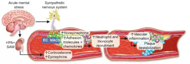德國慕尼黑工業(yè)大學(xué)的研究人員發(fā)現(xiàn),生氣、憤怒、沮喪等(急性精神壓力下)會(huì)通過壓力激素,讓血液中的炎癥性白細(xì)胞遷移到主動(dòng)脈,導(dǎo)致動(dòng)脈中的粥樣硬化斑塊破裂。